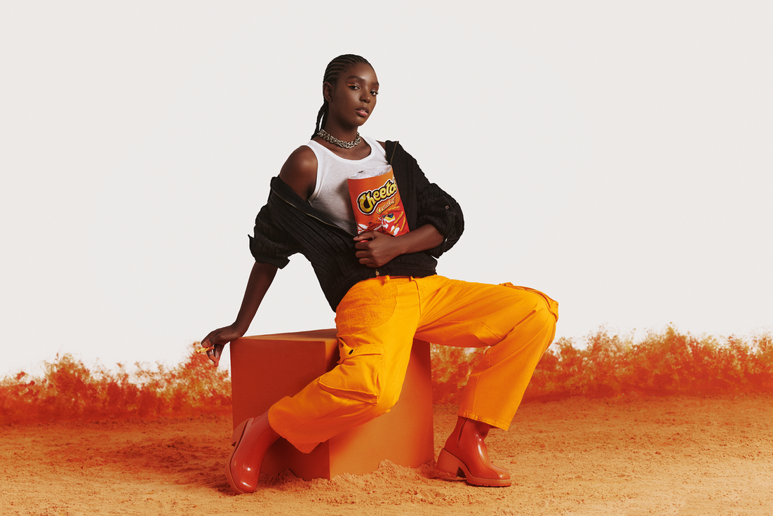 Behold: trousers in the richest shade of Cheeto-inspired orange, reimagined as a bold fashion statement. The thighs are crafted from plush, towel-like fabric—an indulgent touch designed for both comfort and a playful nod to those irresistible, dust-coated fingertips. High fashion meets guilty pleasure. Here is a video reel I helped art direct to capture it in all its glory.